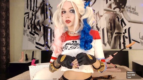 Platinum-blonde teen cosplaying as Harley Quinn gets anal action in a live show