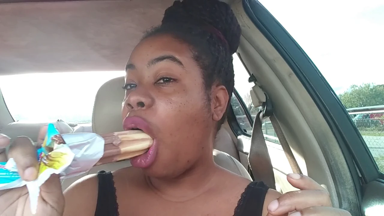 Kurvige afroamerikanische Schönheit Cami Creams gönnt sich ein Eis am Stiel im Auto.